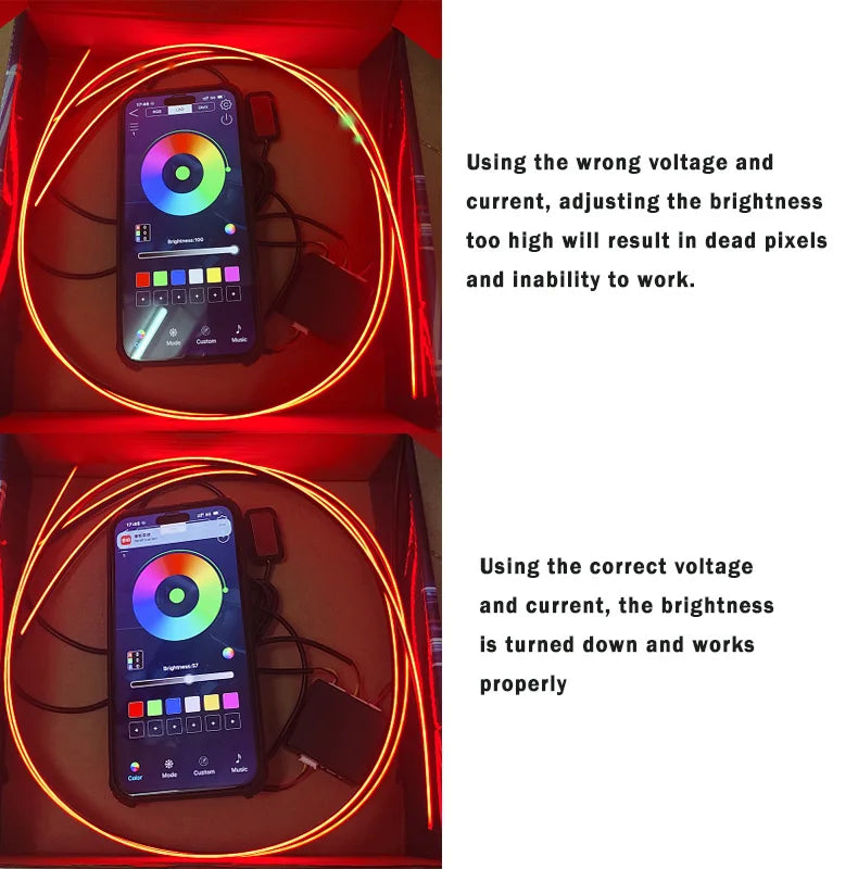 Answer: If you use the wrong voltage and current and adjust the brightness too high, the light strip will burn out and dead pixels will appear. Please use the correct voltage and current, and adjust the brightness on the APP