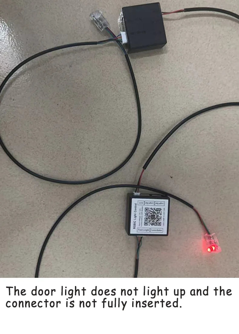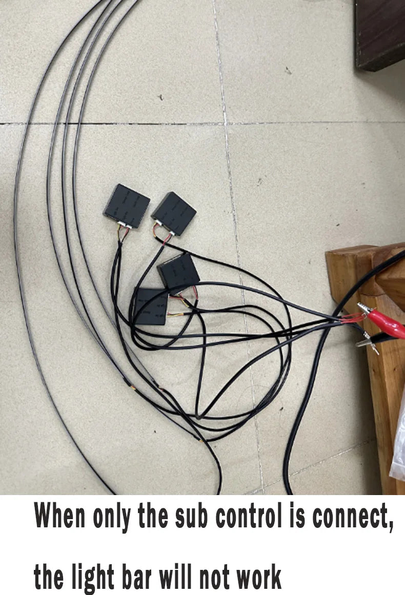 Download the application by the QR code on the main control box first, control light mode via Bluetooth connection. This product includes 1 main control box,4 sub control box. Each controller has a power cable, the main controller is connected to a 5- 12V power supply such as us cigarette lighter (Negative polar and positive polar) and the sub controller also needs to be connected to a 5- 12v power supply such as a door power supply.