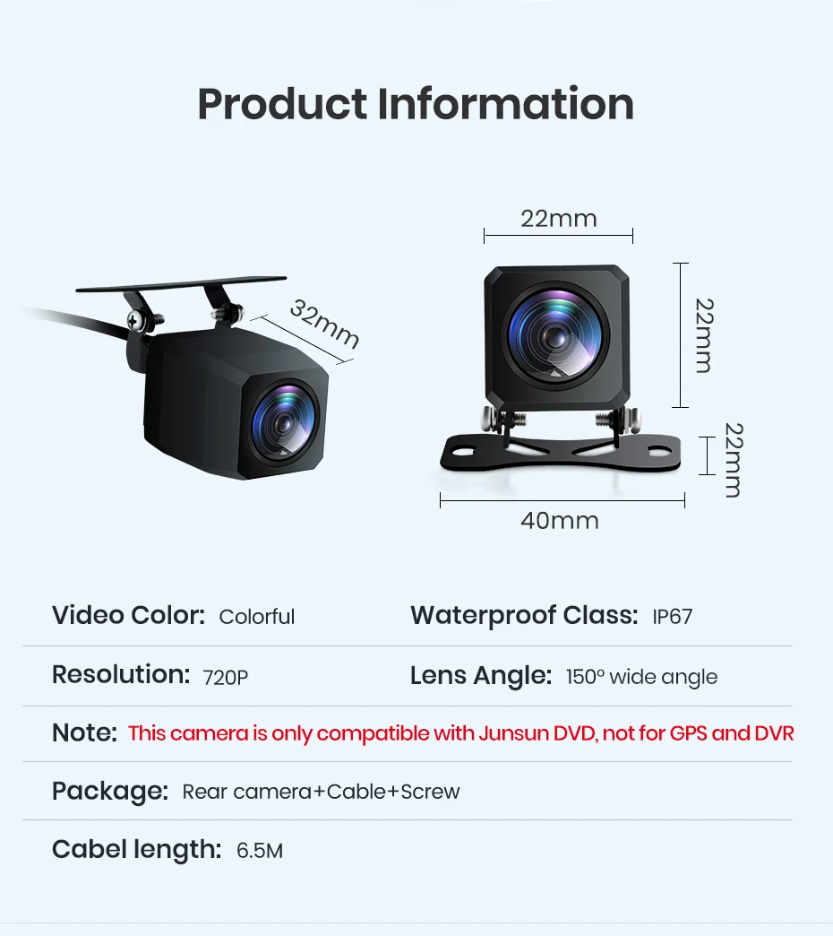 Junsun DVD Car Accessories for Car Rear View Camera 480p 720p Resolution in Waterproof IP67 150 Wide Angle